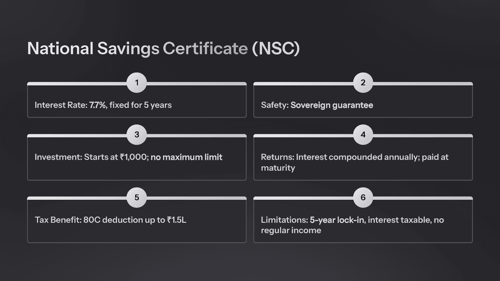 The principal amount invested in NSC qualifies for a Section 80C tax deduction of up to ₹1.5 lakh in a financial year.However, the interest earned is taxable on maturity.