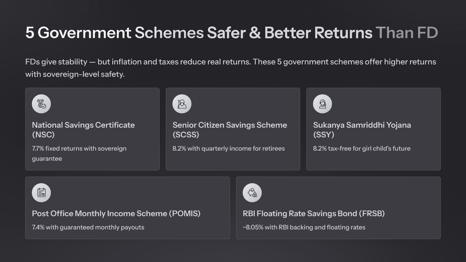 It offers steady interest payouts without any market volatility and carries a full sovereign guarantee — even safer than a bank FD.
