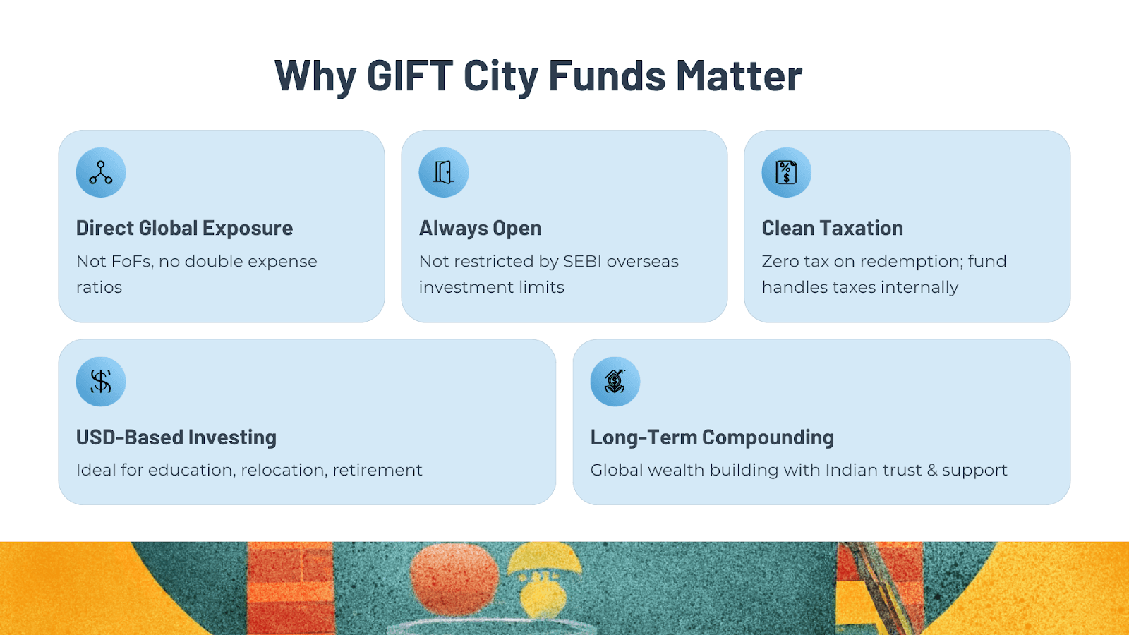 If you prefer building wealth in a stronger currency, GIFT City lets you hold, invest and redeem in USD — giving long-term currency advantage.