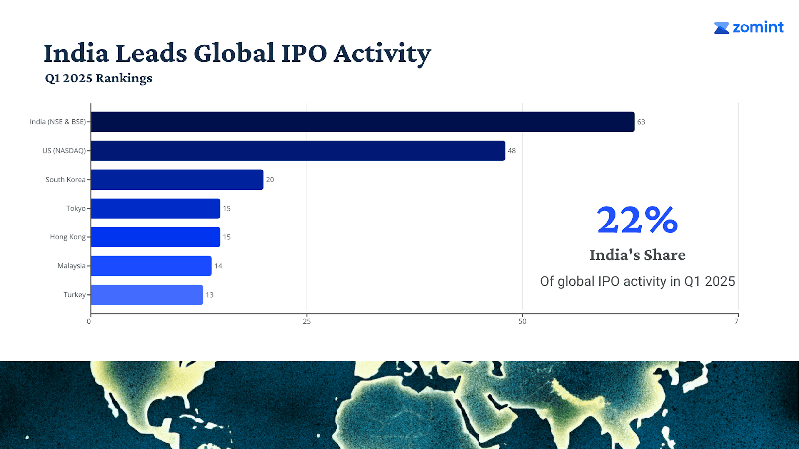 The data below shows that in the first quarter of 2025, India is leading the world in the number of IPOs launched.