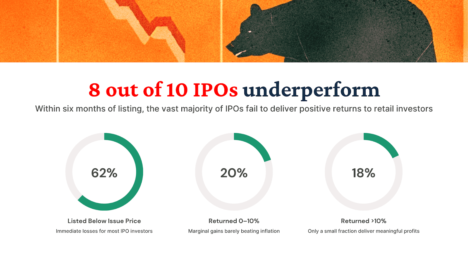 IPOs can deliver exciting returns—but they also carry high risk. Historical data clearly shows that most new listings fail to reward uninformed investors.