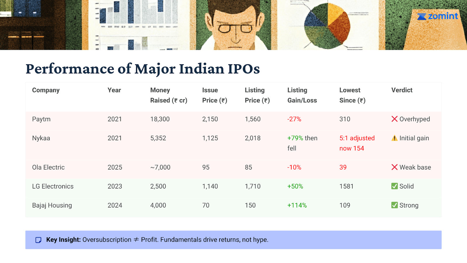"Big brand names always give strong returns." | Not true. A strong brand does not guarantee a strong business. Hype often leads to poor post-listing performance (e.g., Paytm, Nykaa). |